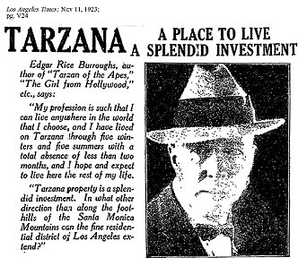 This is my home on Tarzana. I have lived here for four years. I love it here and I believe you will love it. I hope to live here the balance of my life, and that is the reason I am trying to get nice people as my neighbors. I think you will find all of us here on Tarzana good neighbors. We mind our own business, we live our own lives in our own ways and we want you to come here and live your life in the way that you always have wanted to live it -- free from the conventionalities and restrictions of cities and yet with the comforts and luxuries to which you have been accustomed -- and with a great city, with its wonderful shops and theaters, only a few minutes drive from your door, over one of the most magnificent boulevards in the world. |